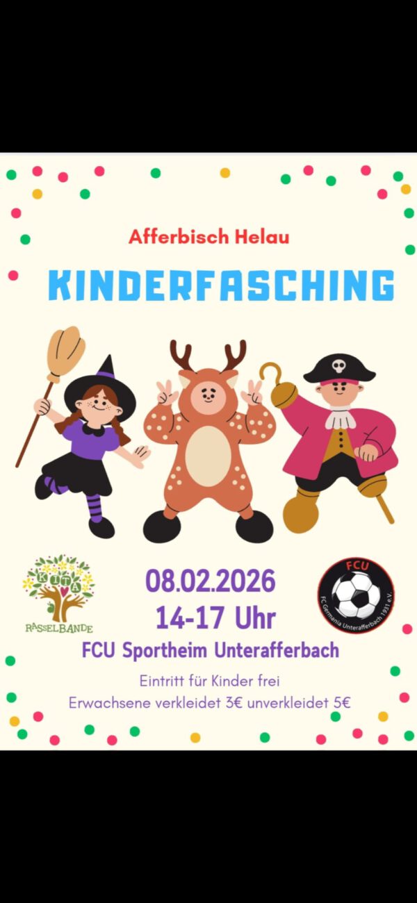 Außerdem möchten wir euch schon jetzt auf unseren Kinderfasching am 8. Februar 2026 von 14 bis 17 Uhr im Sportheim des FCU aufmerksam machen. Unser Faschingsteam hat für die kleinen Narren ein buntes und fröhliches Programm vorbereitet und freut sich auf einen stimmungsvollen Nachmittag. Selbstverständlich sind auch die Erwachsenen herzlich eingeladen, mitzufeiern.