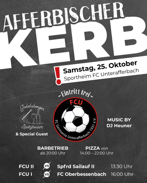 Der FC Germania Unterafferbach lädt recht herzlich zur Afferbischer Kerb am Samstag, 25. Oktober 2025, ins FCU-Sportheim ein!