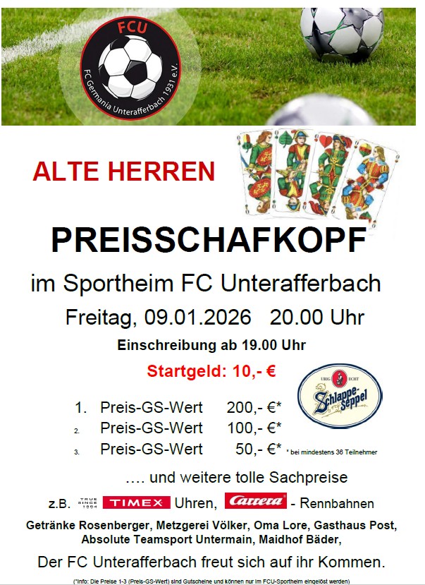 Die Abteilung „Alte Herren“ des FC Germania Unterafferbach veranstaltet am Freitag, 09. Januar 2026, ab 20:00 Uhr wieder ihren traditionellen AH-Preisschafkopf in der FCU-Gymnastikhalle im Sportheim in der Sportplatzstraße 50, 63773 Goldbach.