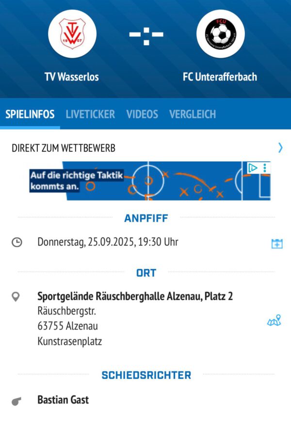 Apropos angepfiffen: das Viertelfinale in Wasserlos wird vom Unparteiischen Bastian Gast geleitet, der für den FC Germania Großwelzheim an der Pfeife steht. Ihm wünschen wir eine verletzungsfreie und fehlerfreie Partie und ein glückliches Händchen bei seinen Entscheidungen.