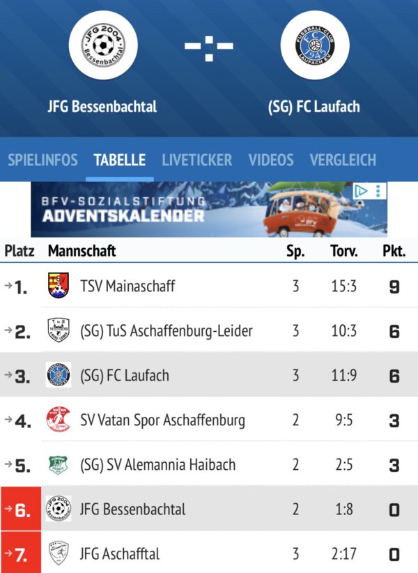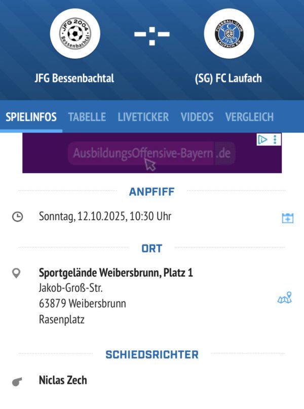 Unsere U17-Junioren der (SG) FC Laufach um Trainer Thomas Neufingerl treten am heutigen Sonntag, 12. Oktober 2025, um 10:30 Uhr bei der JFG Bessenbachtal an – gespielt wird die Partie beim SV Rot-Weiß Weibersbrunn.