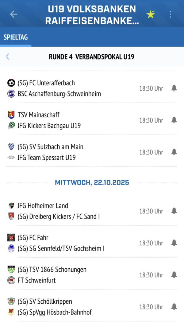 Am Dienstag, 21. Oktober 2025, treten unsers U19-Junioren zum Viertelfinale des Raiba-Pokals im Kreis Aschaffenburg an, die Partie wurde soeben von Spielleiter Peter Mantel online gestellt!